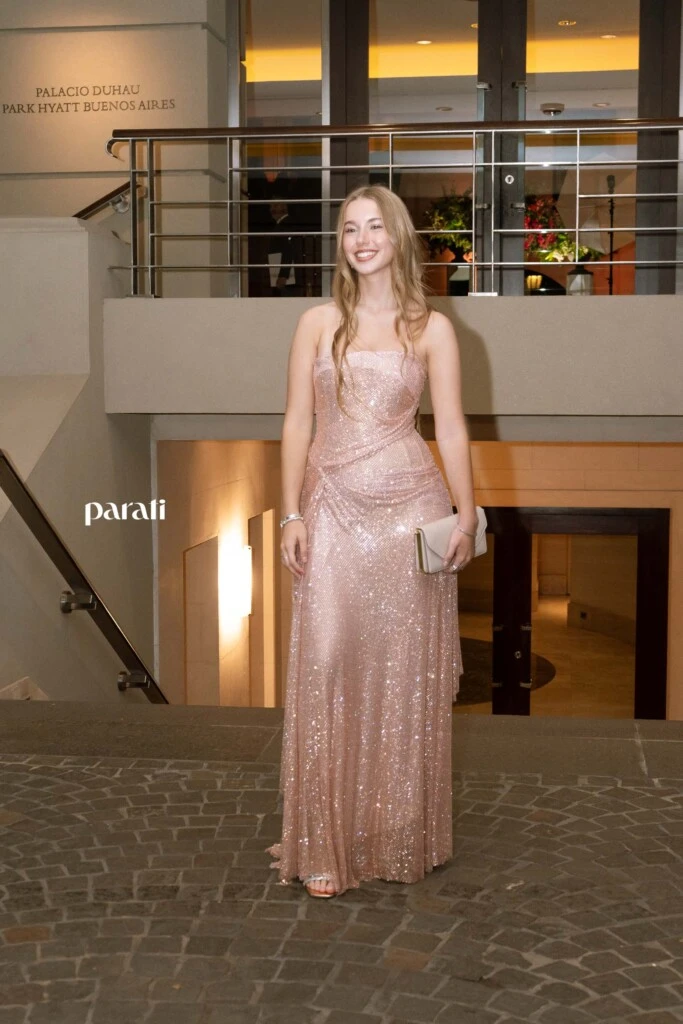El toque de brillo lo aportó Taina Gravier, quien eligió un vestido dorado con lentejuelas y silueta al cuerpo, acompañándolo con una cartera tipo clutch dorada y el pelo suelto con ondas suaves, uno de los beauty looks más comentados de la noche.
