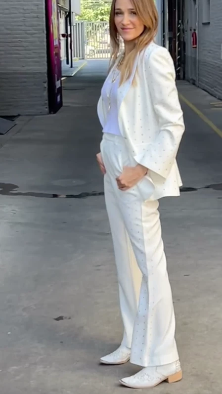 Vemos una segunda propuesta un tanto más formal, que puede adaptarse tanto a una situación de trabajo, como par un cocktail post oficina. A partir de un dos piezas con pantalón sastrero oxford y blazer, bordados con pequeñas tachas, que combinó con una remera blanca básica y texanas al tono.