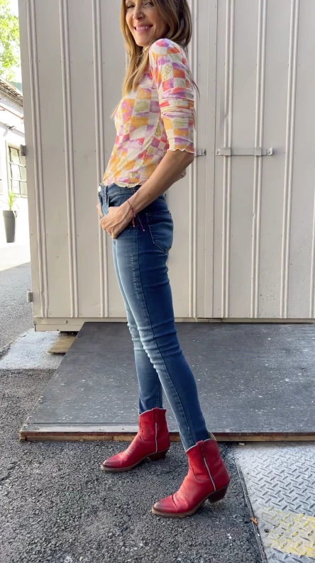 Este look casual y sencillo, compuesto por una remera estampada y un jean, escala con el calzado: unas botinetas rojas con detalles esfumados súper cancheras. Si le sumás un blazer, armás un look working girl descontracturado y muy cómodo.
