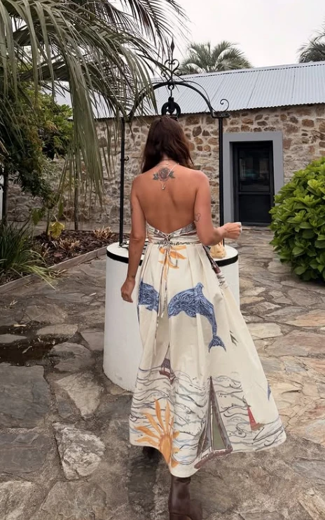 Para la ocasión, la influencer eligió un look fresco y elegante, ideal para una experiencia que combinó naturaleza, alta gastronomía y diseño. Vic apostó por un vestido largo estampado de la diseñadora Valentina Karnouby, de silueta fluida y espíritu relajado, que acompañó a la perfección el clima campestre y sofisticado del encuentro.