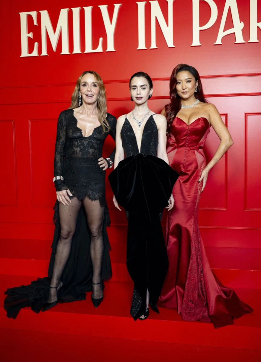 La alfombra roja fue una verdadera postal de la capital de la moda. Lily Collins, protagonista indiscutida de la serie, encabezó la noche con un look que reafirmó su lugar como ícono fashion, acompañada por Philippine Leroy-Beaulieu, Ashley Park y gran parte del reparto que da vida a esta historia atravesada por el romance, el trabajo y el estilo.