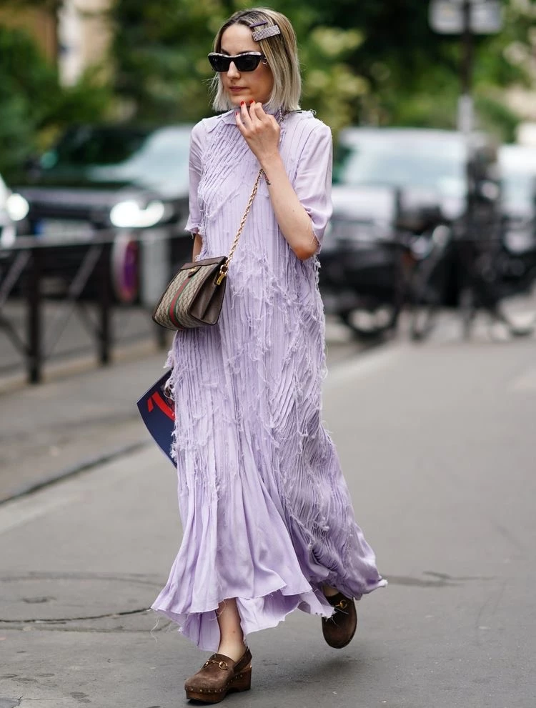 Vestido midi color lila con detalles plisados, zuecos y cartera Gucci. El outfit ideal para ir a trabajar o a un almuerzo y estar bien vestida.