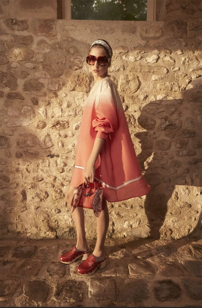 A un vestido corte trapecio y efecto color degradé, la marca eligió sumarle zuecos en tono tomate.