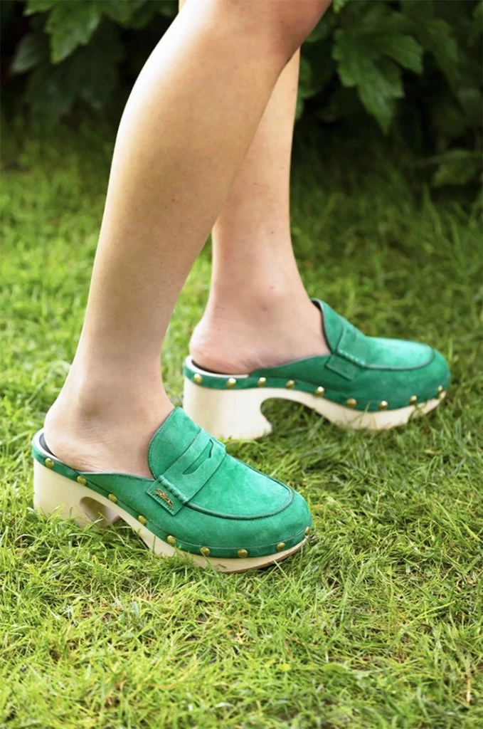 Los zuecos versión 2022 vienen en versión mocasín. Mantienen la plataforma de madera con chinches doradas, pero en el frente engañan pareciéndose al otro calzado que tanto se usó el otoño pasado.