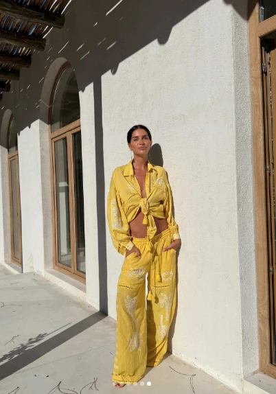 El outfit está compuesto por un conjunto de dos piezas: camisa liviana con bordados artesanales y pantalón amplio de lino, una elección ideal para climas cálidos. La camisa, llevada anudada a la cintura, aporta un aire relajado y sensual, mientras que el pantalón suelto equilibra el look con comodidad y movimiento.
