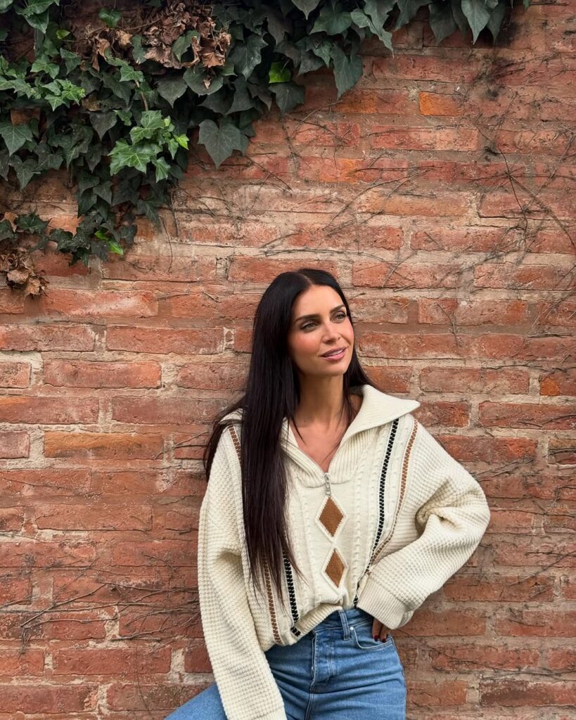 El protagonista del look es sin dudas el suéter de punto en color crudo, con cuello amplio estilo polo y recortes frontales con apliques de cuero. Una prenda que, lejos de ser básica, eleva el outfit con un aire trendy y sofisticado. Las líneas verticales en contraste aportan un guiño retro y estilizan la figura.