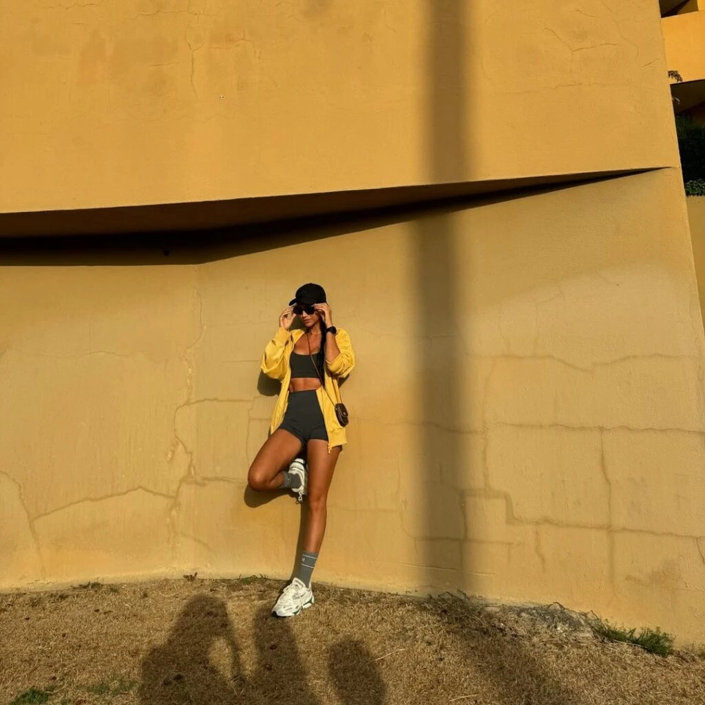 Zaira le sumó medias tres cuartos al tono, en un tono de gris oscuro, zapatillas deportivas blancas, y una campera de algodón abierta en color amarillo.