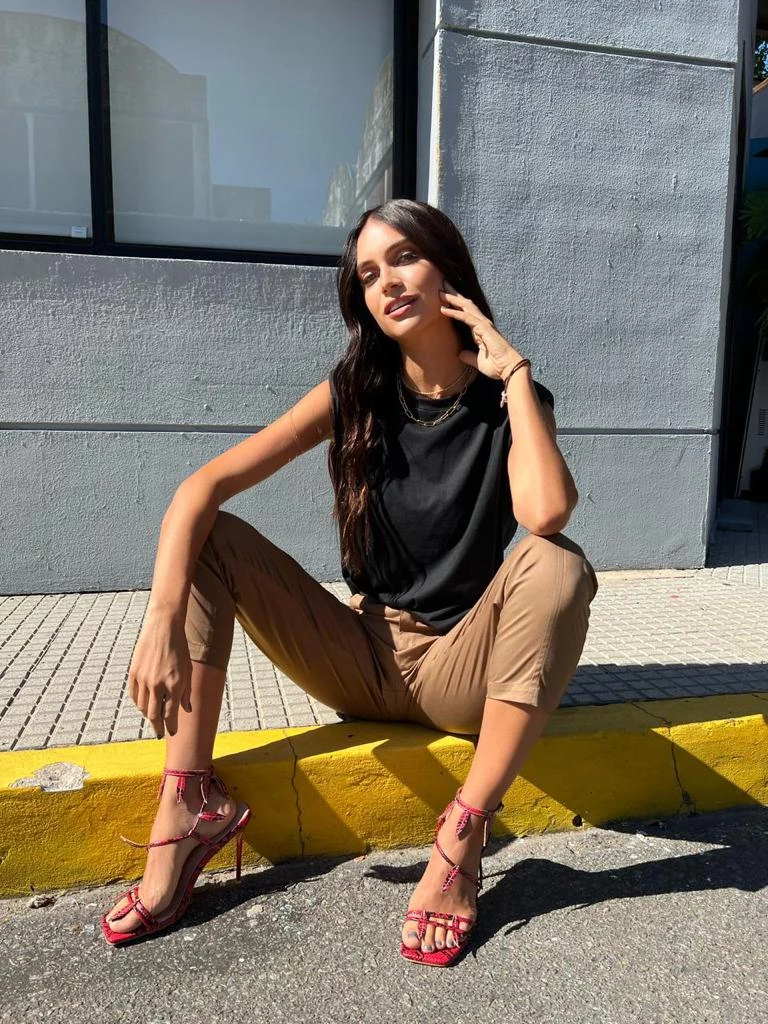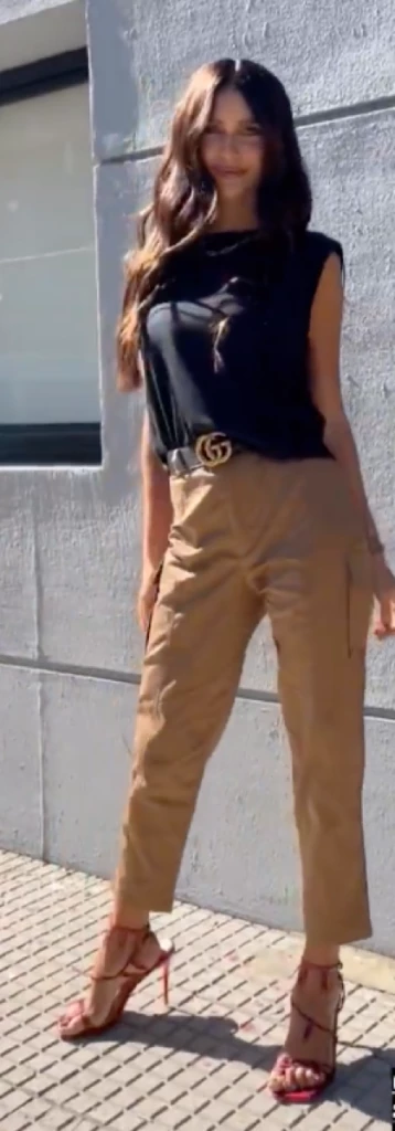 Los combinó con una remera sin mangas con hombreras, cinturón con hebilla de Gucci y le sumó unas sandalias bien altas con lace up para aportar más glam al look.