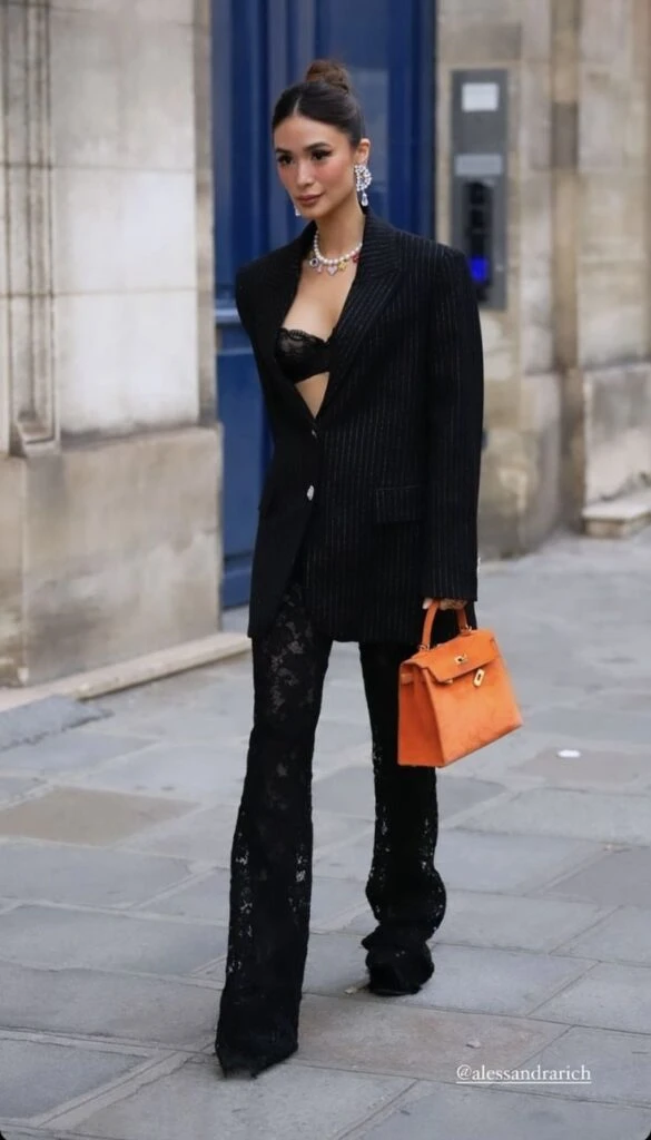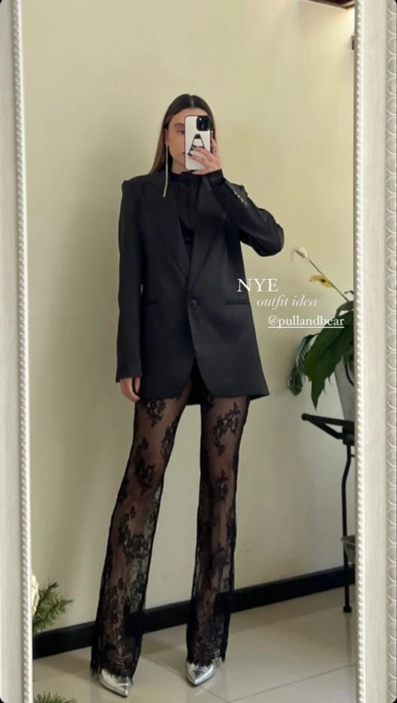 Por debajo del saco, Zaira incluyó un body de encaje negro, con mangas largas (que se asomaban por las mangas de su saco).