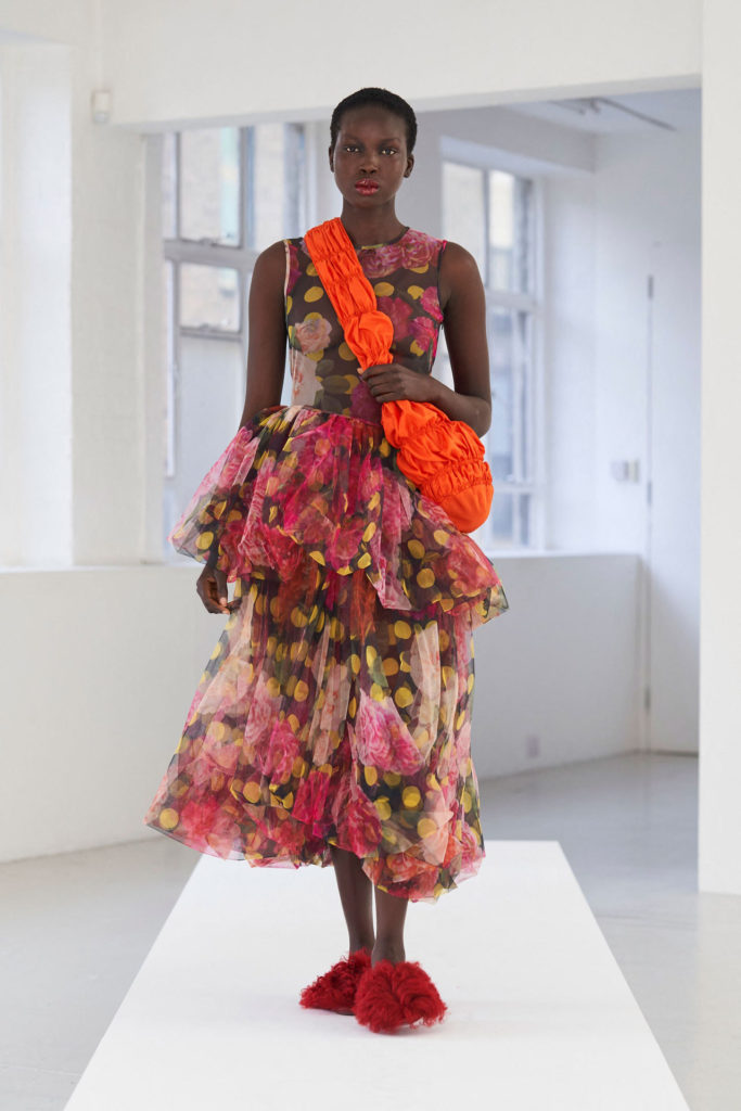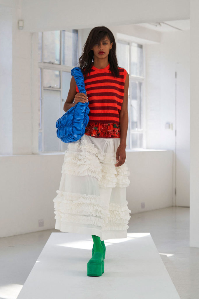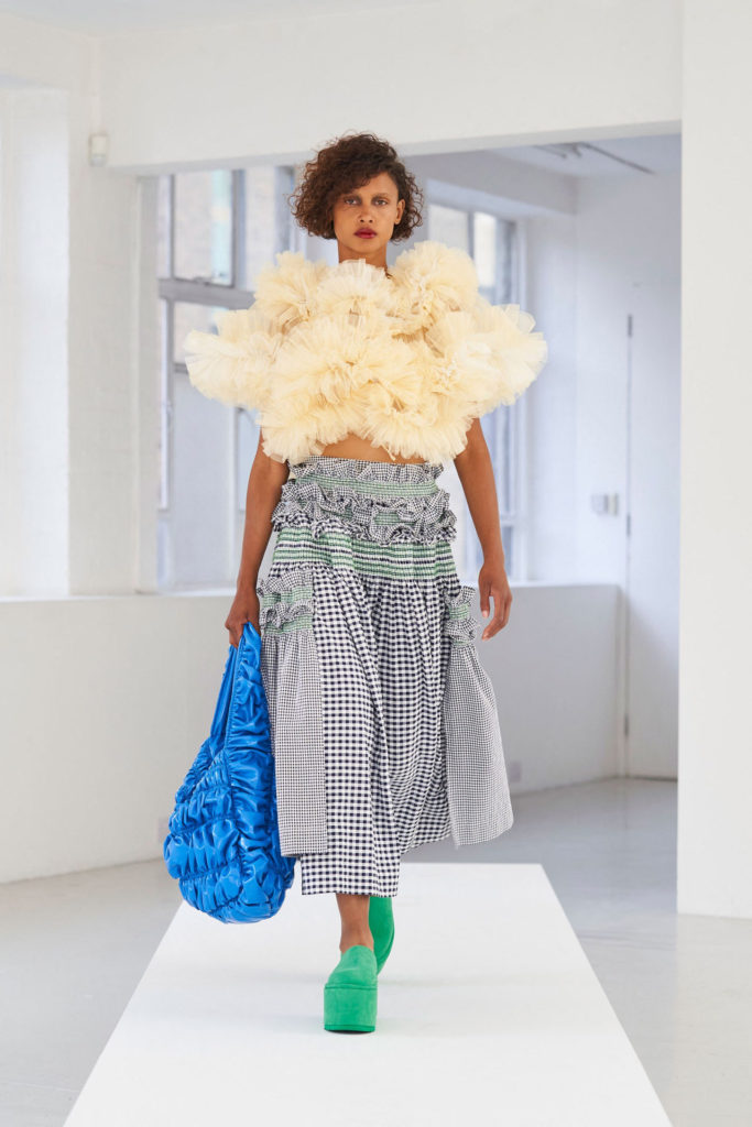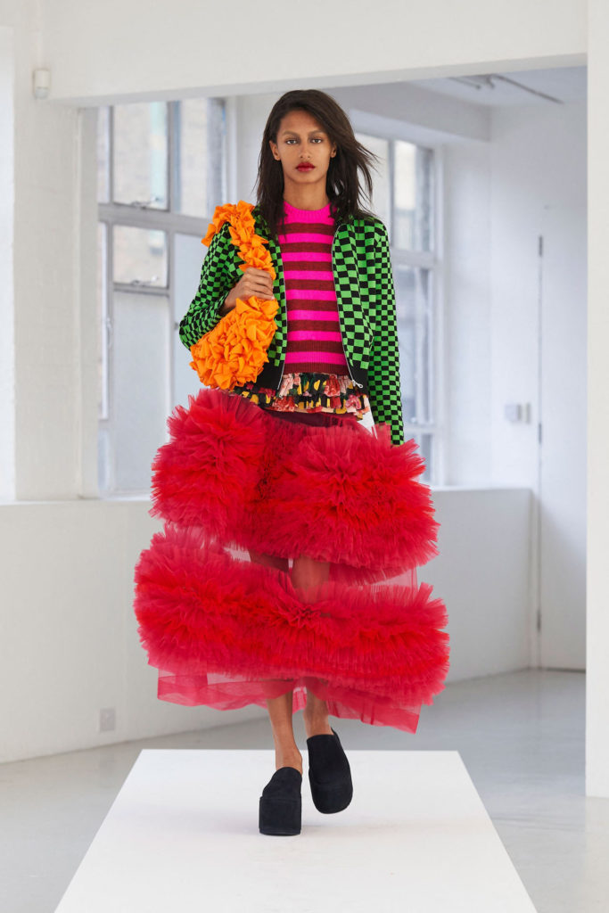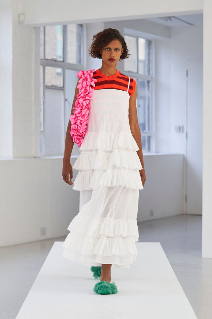 Como otros diseñadores londinenses, Molly Goddad decidió darle color a su nueva colección después de tanta tristeza mundial que provocó el covid-19. Su nueva colección fue presentada en su estudio en Bethnall Green, a través de un video virtual dentro del marco de la Semana de Londres. Cascada de volados adornaban los vestidos y las faldas en vibrantes colores, como el rosa, el verde y el naranja. Una propuesta exótica, lúdica y alegre que se complementó con botas Uggs a contratono de los equipos. Como novedad, incorporó piezas en blanco para inspirar a las jóvenes a casarse y ser una novia única y perfecta.