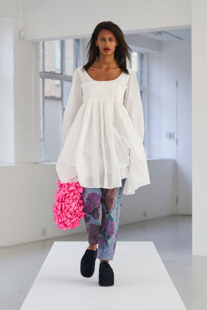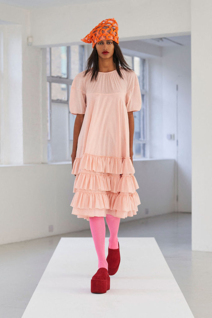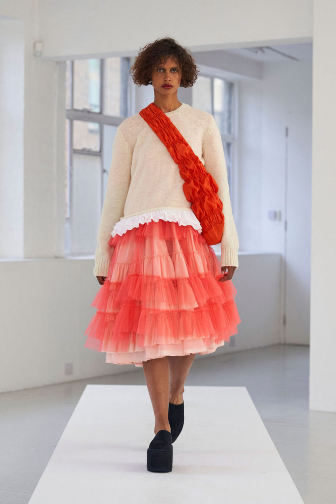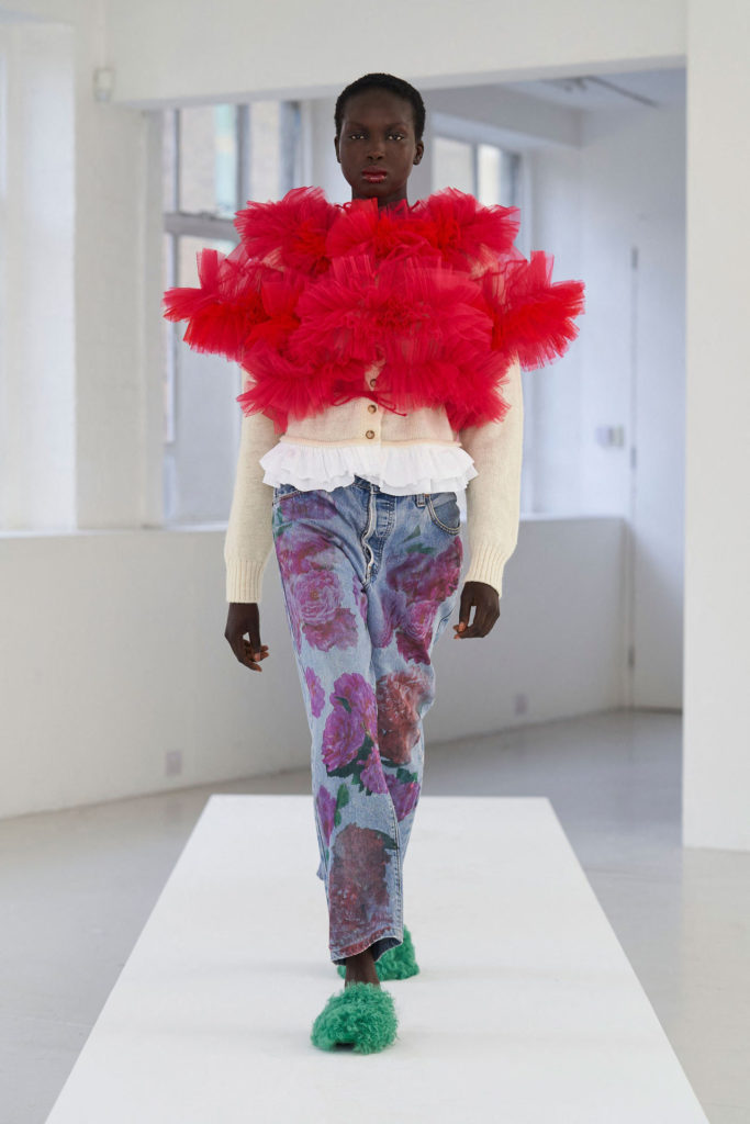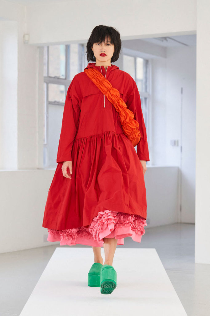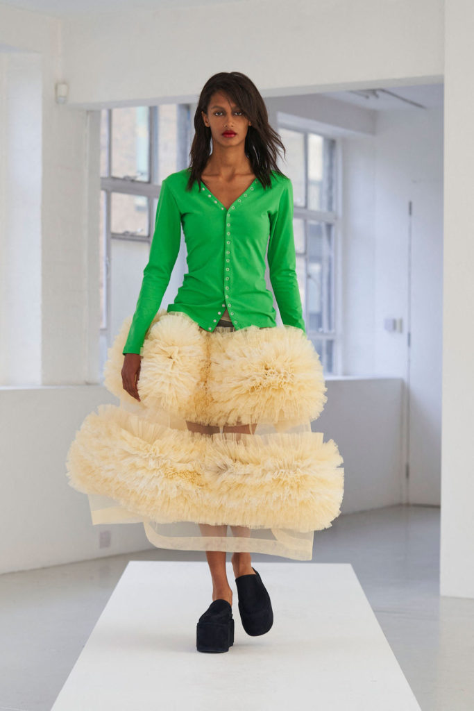 Como otros diseñadores londinenses, Molly Goddad decidió darle color a su nueva colección después de tanta tristeza mundial que provocó el covid-19. Su nueva colección fue presentada en su estudio en Bethnall Green, a través de un video virtual dentro del marco de la Semana de Londres. Cascada de volados adornaban los vestidos y las faldas en vibrantes colores, como el rosa, el verde y el naranja. Una propuesta exótica, lúdica y alegre que se complementó con botas Uggs a contratono de los equipos. Como novedad, incorporó piezas en blanco para inspirar a las jóvenes a casarse y ser una novia única y perfecta.