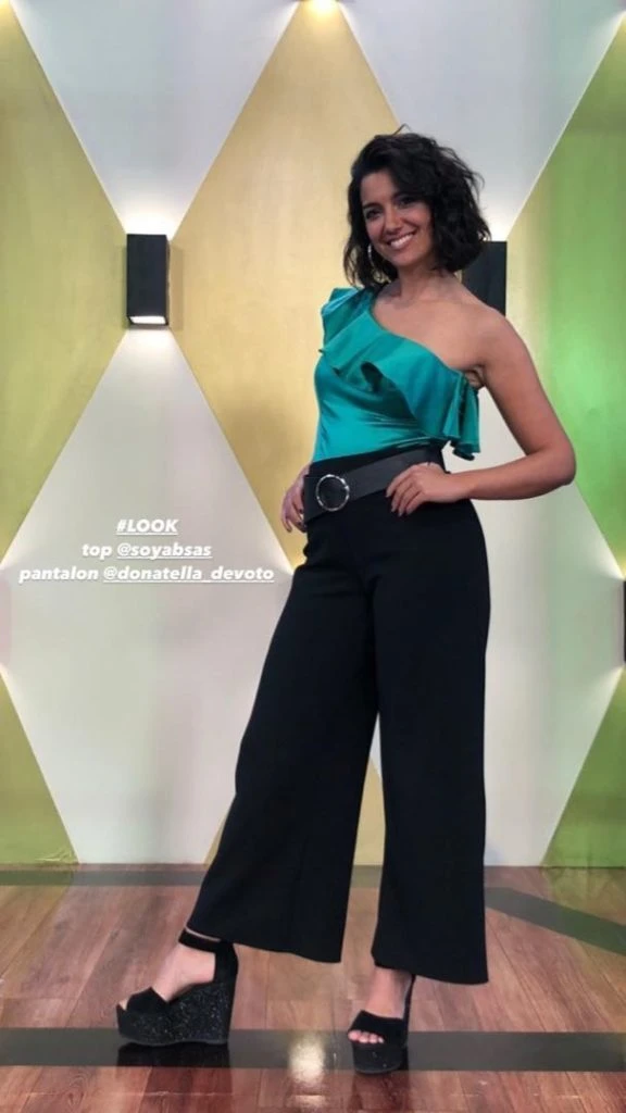 La periodista Jimena combinó su pantalón palazzo negro (coincidió con Solita), con un top de un solo hombro, con volado en color verde satinado. Completó el look con sandalias negras con plataforma.