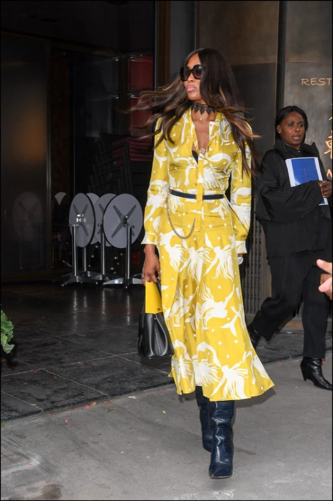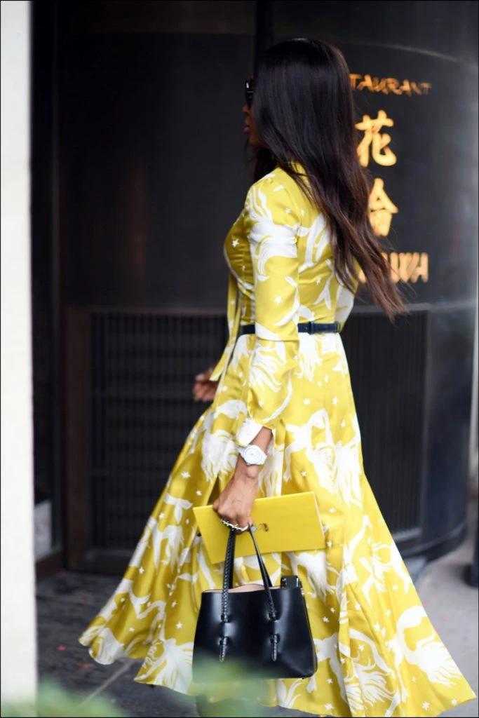 Al día siguiente sorprendió con un cambio de look. Primero se la había visto al mediodía en el restaurante Hanawa de París, donde deslumbró con un look muy llamativo: un vestido camisero estampado en amarillo y blanco que combinó con botas altas.