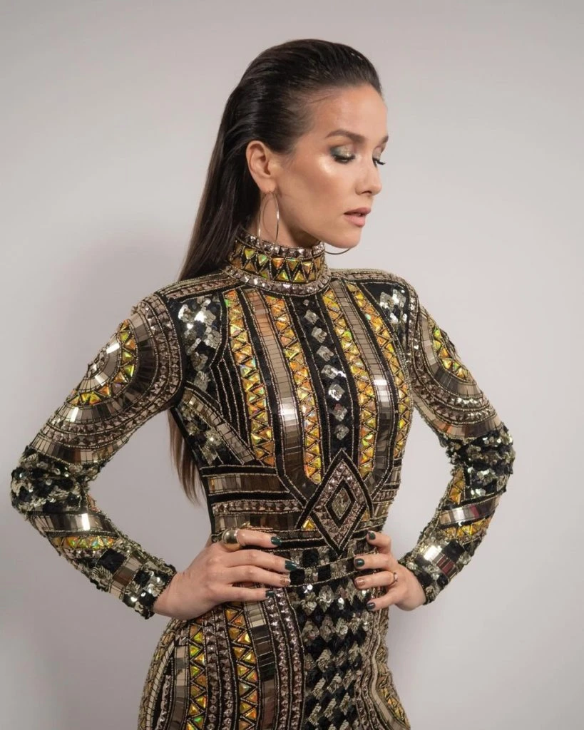 Para esta ocasión llevó un mini vestido al cuerpo integramente bordado con tachas y piedras en tonos metalizados.