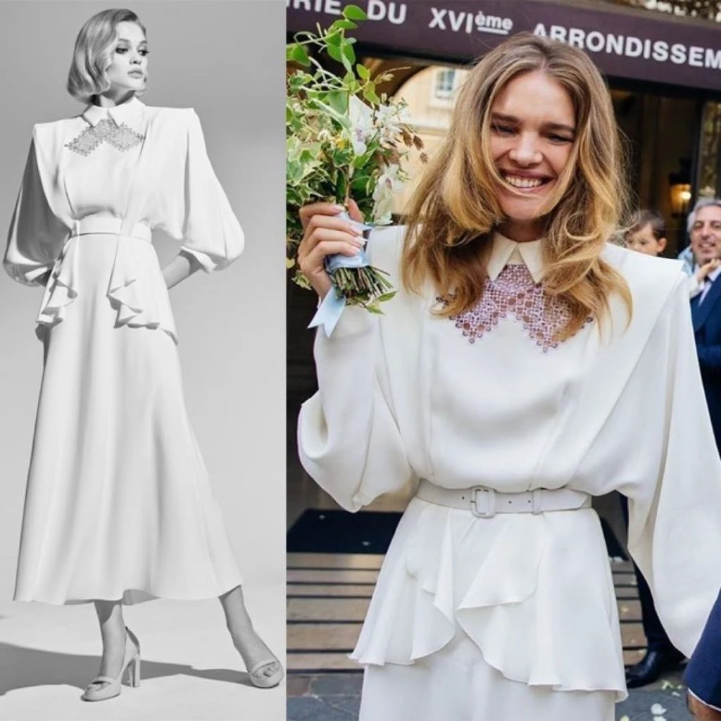 Natalia fue la novia más chic del año con un diseño de la etiqueta rusa Ulyana Sergeenko Couture. Se trata de un vestido midi, elaborado en seda, que forma parte de la colección de Alta Costura Otoño/Invierno 2020/21. Una prenda de estilo vintage que parece un dos piezas, es en realidad un vestido cinturón que afina el talle. Además lleva un cuello camisero, con detalles de encaje krestetskaya strochka en color malva. La modelo completó el look con stilettos a tono y un ramo muy silvestre con predominio de hojas verdes.