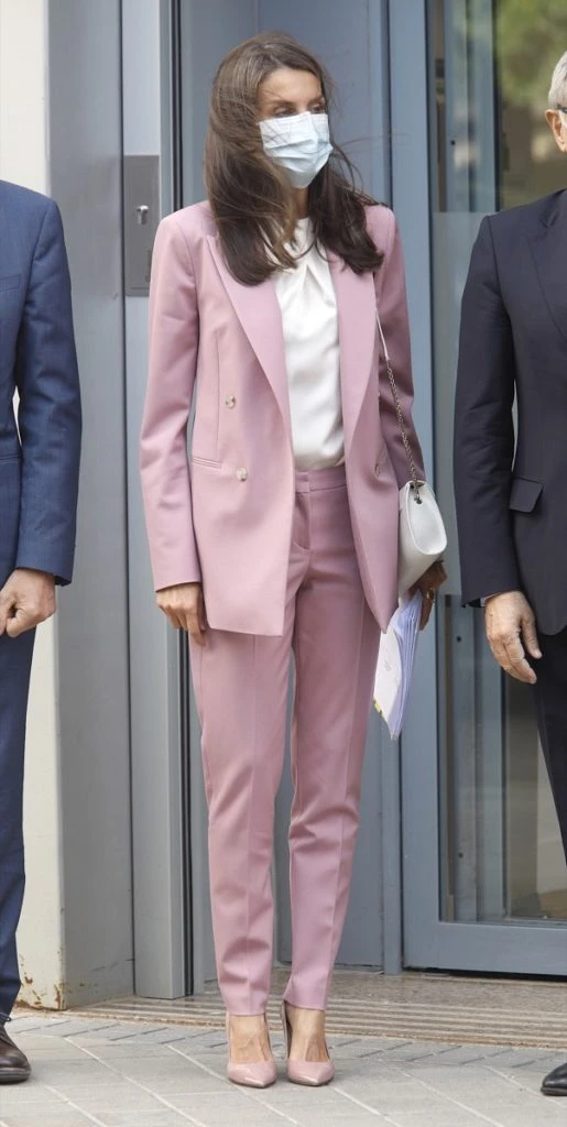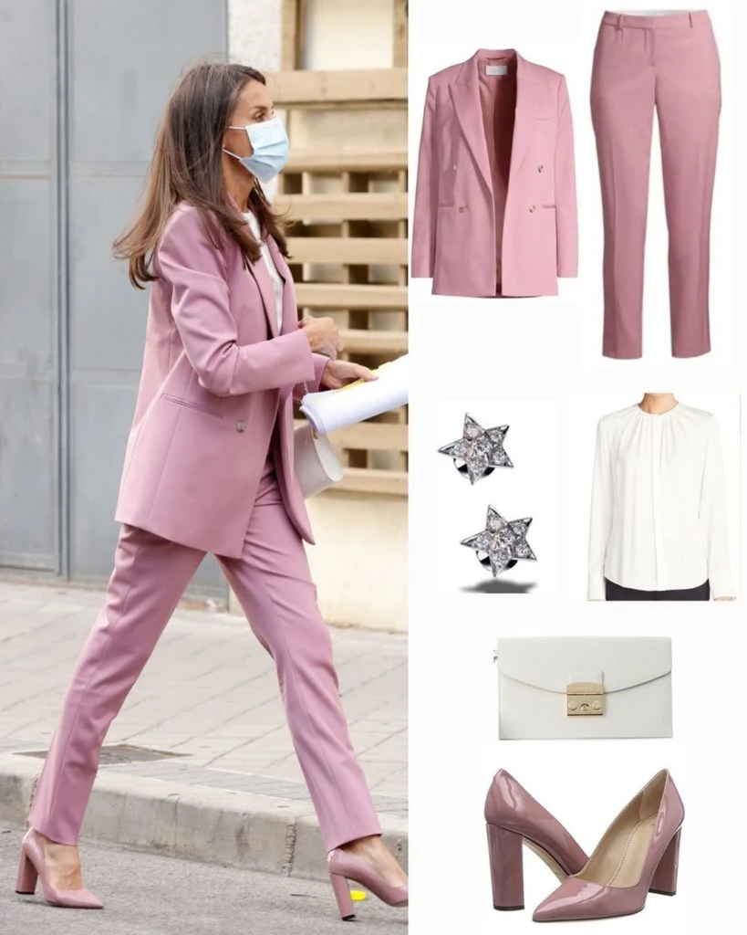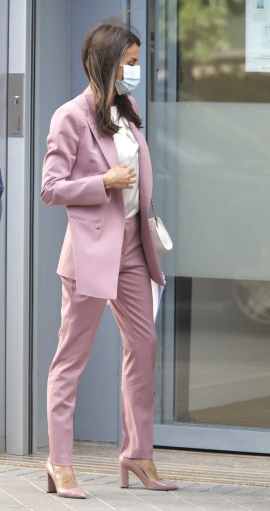 Con este outfit, la monarca muestra un look ideal para un día de oficina: Un traje en color rosa compuesto por un saco con hombreras marcadas, pantalón recto a los tobillos, y stilletos al tono. También podés lookeralo con zapatillas para lograr un look más trendy.