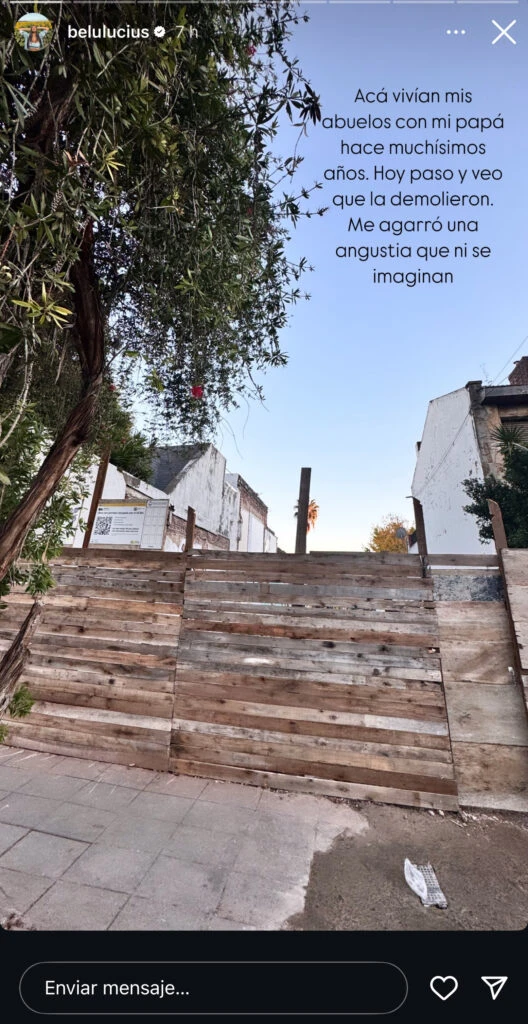 "Acá vivían mis abuelos con mi papá hace muchísimos años. Hoy paso y veo que la demolieron. Me agarró una angustia que ni se imaginan", escribió en sus historias de Instagram, junto a un video donde se ve el terreno vacío, cercado y sin rastros de lo que alguna vez fue un hogar lleno de recuerdos.