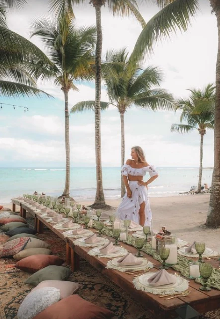 Pampita celebró a orillas del mar turquesa, entre palmeras y arena blanca y el festejo se caracterizó por una gran mesa imperial baja y decorada con colores verde olivo, beige, Ivory y rosa pálido. Un estilo bohemio, con mantel de gaza y cubiertos en dorado.
