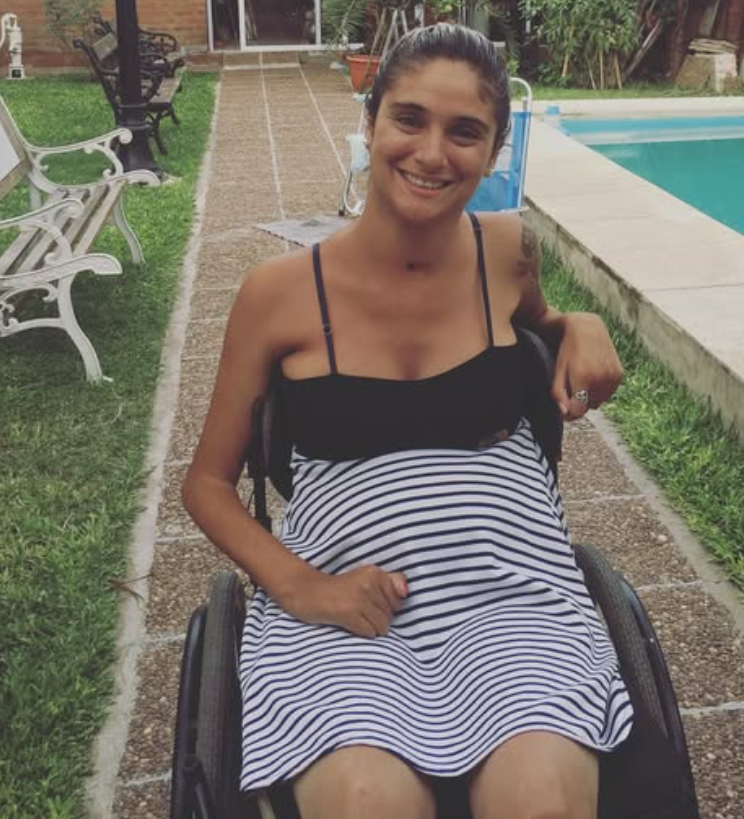 -Aquel día, un 31 de diciembre de 2010, yo estaba en la casa una amiga, tenía 14 años y quise hacer un salto mortal en el aire en una pileta pelopincho, me paré en uno de los esquinero y salté. Y cuando caí, toqué mi cuello con el piso. En ese momento, se me desplazó la médula, quedé inmóvil, bajo el agua, no podía salir. La mamá de mi amiga fue a buscarme para almorzar y vio que yo estaba sola en el fondo de la pileta, entonces llamó a Emanuel, que es el hermano de esta amiga y él me sacó de la pileta de los pelos.