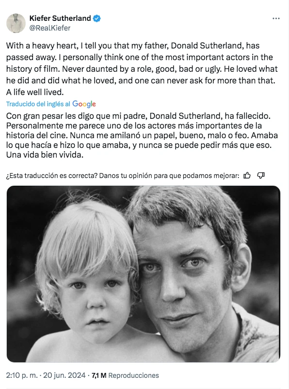 "Con gran pesar les digo que mi padre, Donald Sutherland, ha fallecido. Personalmente me parece uno de los actores más importantes de la historia del cine. Nunca tuvo miedo de interpretar cualquier papel, bueno, malo o feo. Amaba lo que hacía e hizo lo que amaba, y nunca se puede pedir más que eso. Una vida bien vivida", escribió el artista en la red social X.