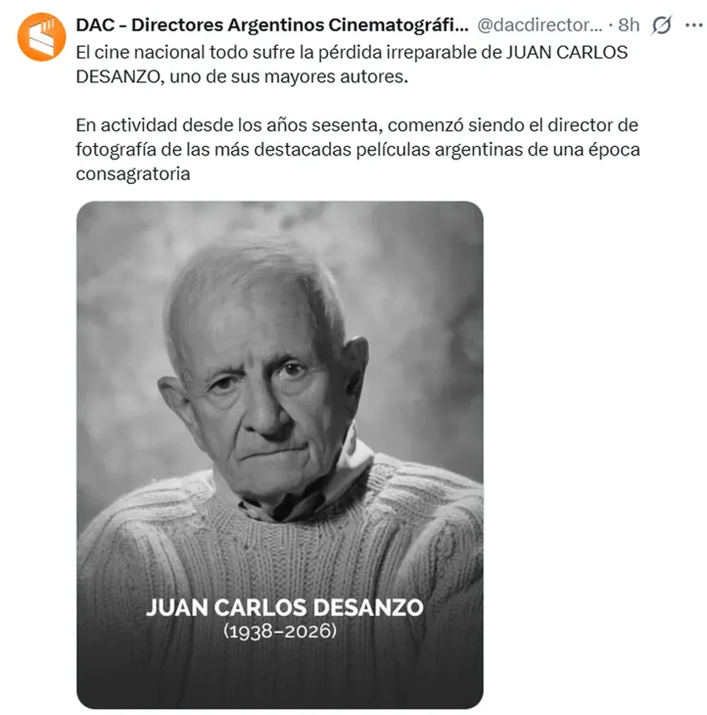 “El cine nacional sufre la pérdida irreparable de Juan Carlos Desanzo, uno de sus mayores autores”, expresaron desde la asociación, destacando la magnitud de su trayectoria y su compromiso con la industria audiovisual argentina.