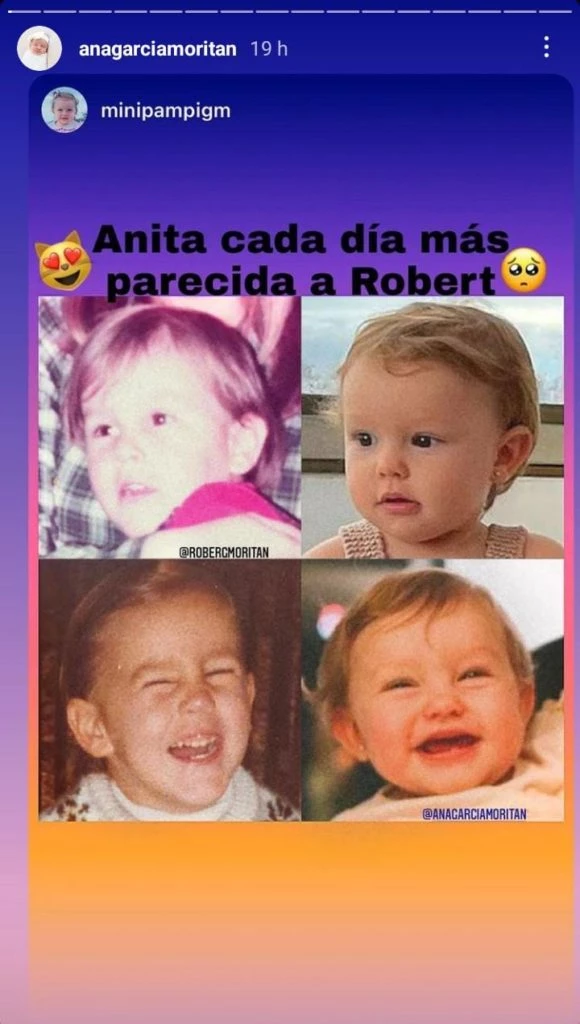 En esta oportunidad, replicó un posteo de una cuenta fan de su hijita donde mostraban el gran parecido entre ella y su padre Moritán. "Anita cada día más parecida a Rober", expresa la publicación que Carolina Ardohain decidió compartirlo en las historias de su red social.