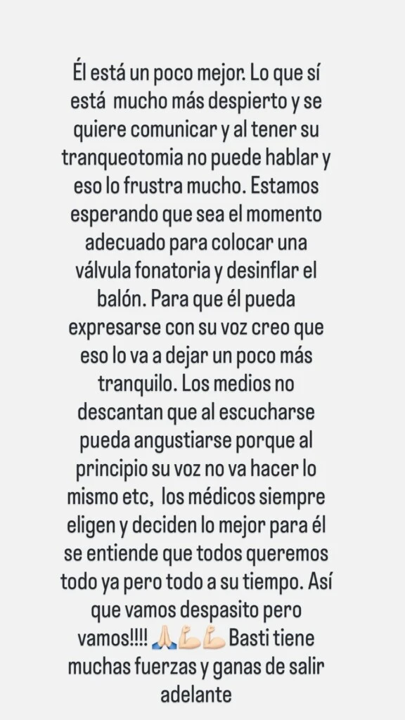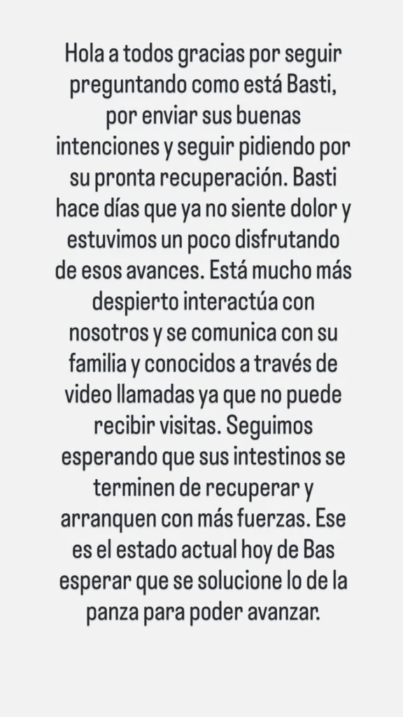 Sin embargo, aclaró que aún quedan aspectos importantes por resolver en su recuperación. “Seguimos esperando que sus intestinos se terminen de recuperar y arranquen con más fuerzas. Ese es el estado actual hoy de Basti: esperar que se solucione lo de la panza para poder avanzar”, explicó.