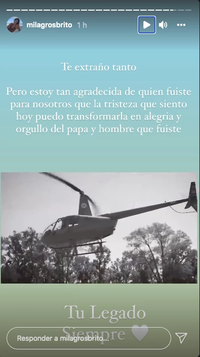 "Te extaño tanto. Pero estoy tan agradecida de quien fuiste para nosotros que la tristeza que siento, hoy puedo transformarla en alegría y orgullo del papá y hombre que fuiste", escribió la ex esposa de Moritán junto a la foto de un helicóptero, aeronave que piloteaba Jorge Brito cuando perdió el control y terminó estrellándose en el dique Cabra Corral de la provincia de Salta.