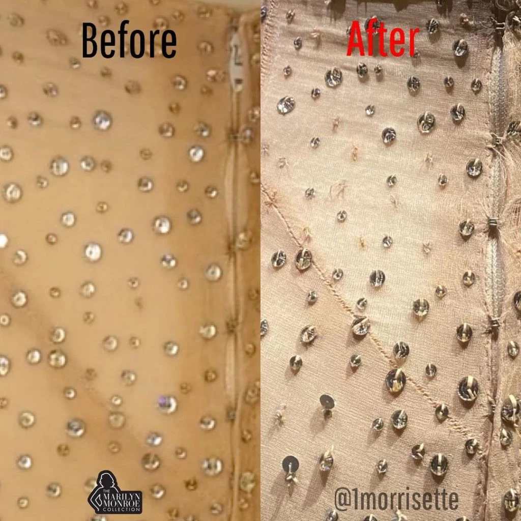 Luego, compartió varias imágenes donde muestra que el diseño ceñido en color nude y adornado con más de 6 mil cristales cosidos a mano, sufrió daños. En los antes y después, mostró que en la parte trasera, por ejemplo, le faltan cristales y algunos están colgando. Además, la tela está rasgada en la zona de la cremallera.