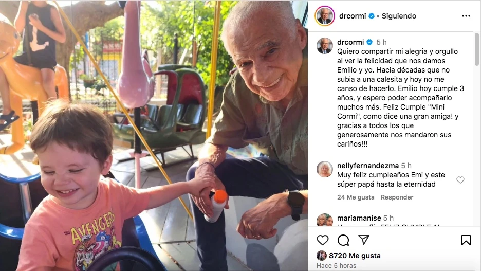 "Quiero compartir mi alegría y orgullo al ver la felicidad que nos damos Emilio y yo. Hacia décadas que no subía a una calesita y hoy no me canso de hacerlo. Emilio hoy cumple 3 años, y espero poder acompañarlo muchos más", expresó. Y continuó: "Feliz Cumple `Mini Cormi´, como dice una gran amiga y gracias a todos los que generosamente nos mandaron sus cariños".