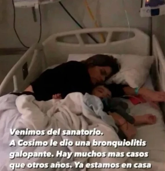 Junto a una imagen donde se la veía en la cama de una clínica con su hijo menor, Balbiani explicó la situación: "Venimos del sanatorio. A Cósimo le dio una bronquiolitis galopante. Hay muchos más casos que otros años", se lamentó.