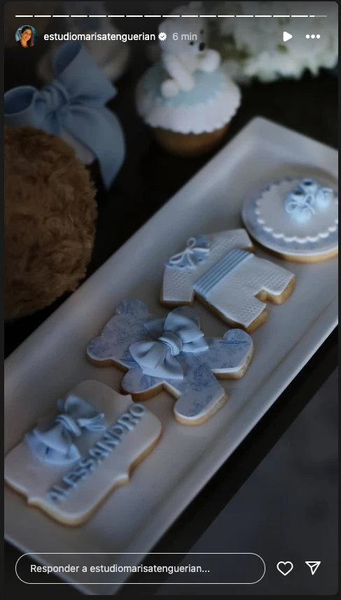 Para la ocasión, Angie confió en la reconocida decoradora Marisa Tenguerian, quien diseñó una ambientación delicada, chic y totalmente personalizada. El concepto giró en torno a una paleta en celeste y blanco, con osos de peluche marrones como protagonistas, aportando una estética tierna y elegante a la vez.