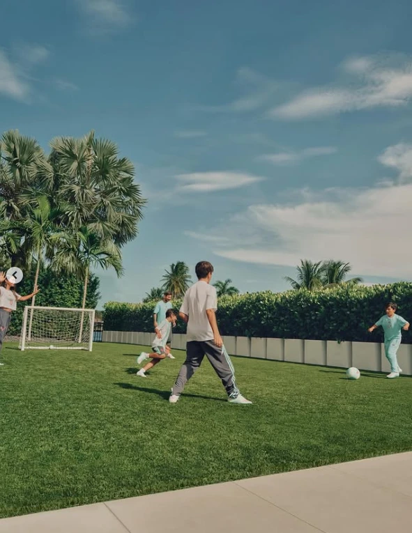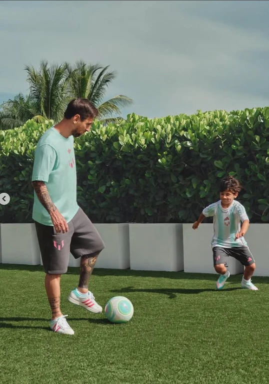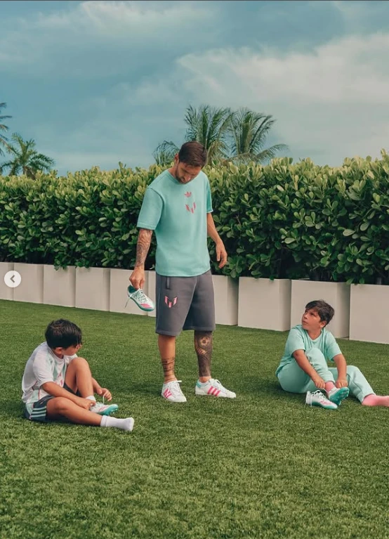 En las fotos, el clan posa en un jardín tropical, entre palmeras y césped perfecto, vestidos con looks deportivos en tonos pastel. Messi aparece sonriente, relajado, mientras los chicos sostienen la pelota y miran a cámara con naturalidad. Antonela, de rodillas en el pasto, completa la escena con una imagen que transmite complicidad y unión.