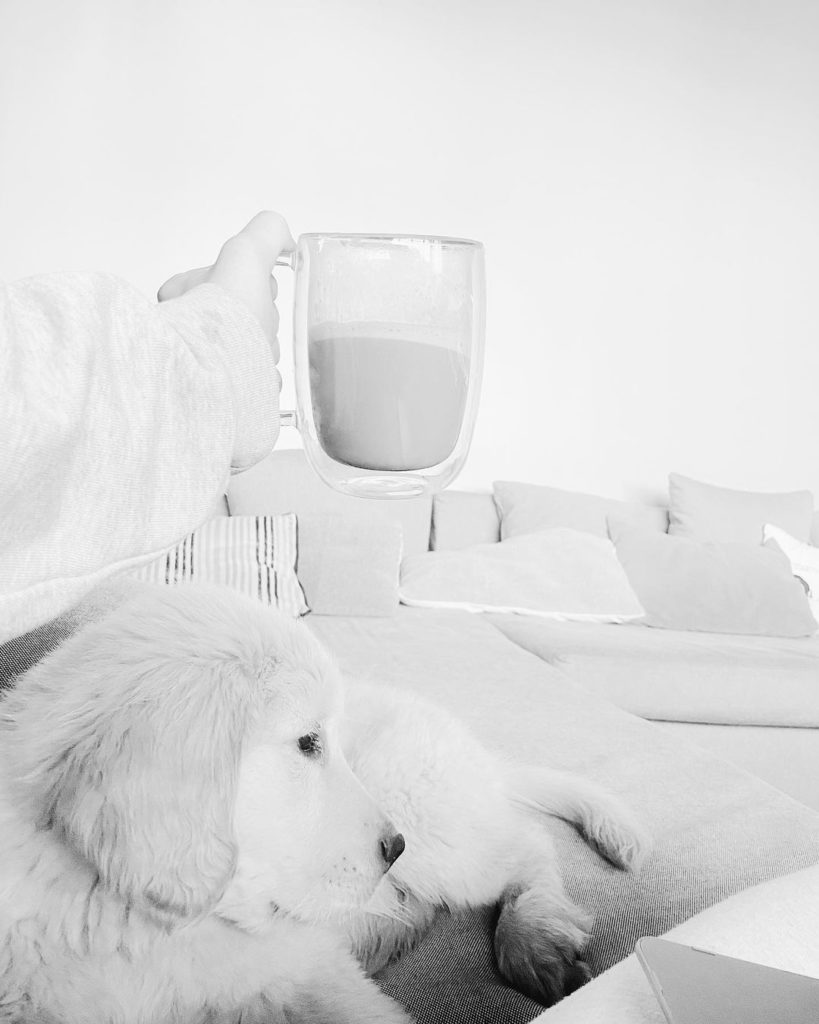 Con una foto blanco y negro, muestra que tiene en su mano una taza con café con leche, enseña a su mascota, un cachorro de labrador, y de fondo, los sillones del living de su casa.