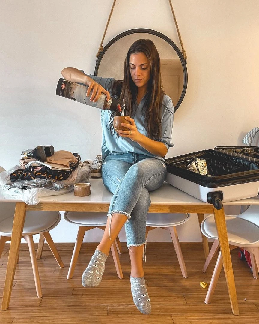 En el mismo ambiente, Belu tiene el comedor que está resuelto con mesa con patas de madera de haya y tapa blanca. La acompañan cuatro sillas Tulip blancas. Sobre la pared colgó un espejo circular con marco negro y sogas. Muy original.