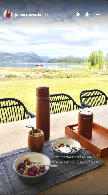 "Amé mi nuevo set de mate", escribió Juliana sobre una foto de la mesa servida al aire libre donde se ve la infusión lista, el termo y un pote con cereales y frutos rojos. El paisaje no puede ser más hermoso, con el lago y las montañas a lo lejos.