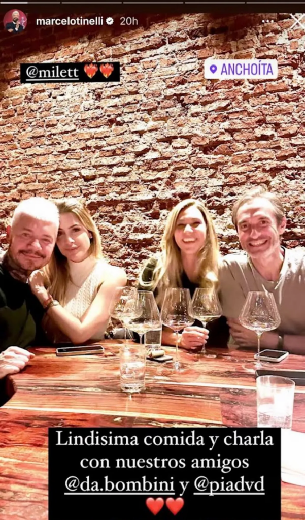 Además de su emocionante viaje, Tinelli también estuvo en el centro de atención por su relación con Milett Figueroa. A pesar de algunos rumores de crisis, la pareja se muestra más enamorada que nunca. Recientemente, el conductor compartió en sus redes sociales una foto de una salida romántica junto a su novia y una pareja amiga en un conocido bar del barrio porteño de Chacarita, conocido por su amplia variedad de vinos de calidad. “Lindísima comida y charla con nuestros amigos”, expresó Tinelli, acompañado de emojis de corazones con fuego, mencionando a la modelo y actriz peruana.
