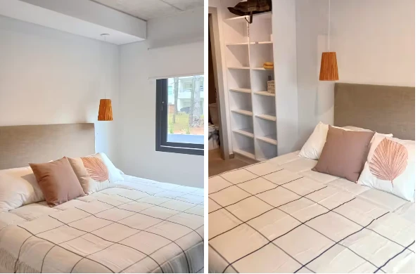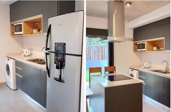 El edificio cuenta con arquitectura moderna, y cada departamento ofrece una cocina totalmente equipada, lavarropas, y un acogedor living con sofá cama y TV de 50.