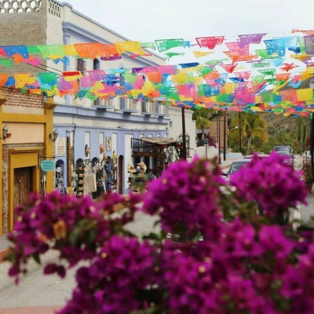 La aridez de la zona se contrasta con la variedad de colores que decoran las fachadas. La calle principal tiene un sinfín de guirnaldas mexicanas surcando el cielo, lo que la convierte en una suerte de galería mágica.