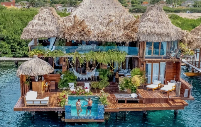 El resort redefine el concepto de lujo. Se trata de un exclusivo complejo de villas construidas sobre el mar, con estructuras de madera, techos de paja y una estética orgánica que se funde con el entorno.