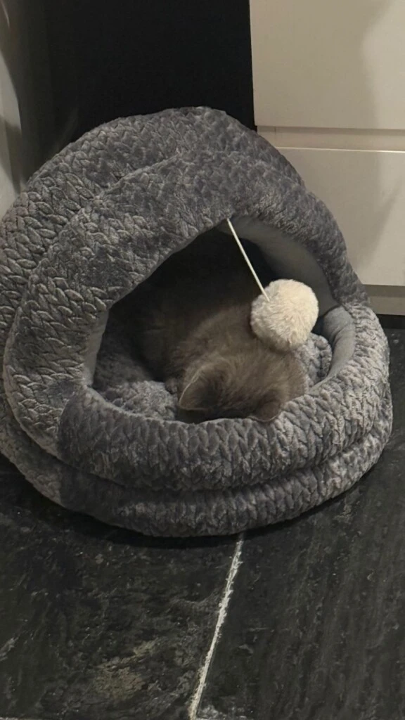 Entre las postales cotidianas, Clara también compartió a su gato descansando en una camita gris acolchonada, un gesto que resume la calidez de su hogar y su amor por los animales.