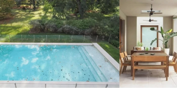 El área exterior mantiene la misma línea estética del interior. Jardín, galería y pileta conforman un sector orientado al relax y a los encuentros sociales. La vegetación cumple un rol central, aportando frescura y equilibrio visual, mientras que los materiales elegidos —madera, cemento alisado y textiles claros— refuerzan la idea de armonía.
