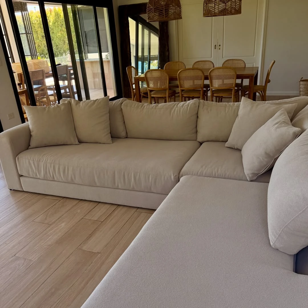 En ese mismo ambiente, Marzol mostró parte del nuevo mobiliario, con una clara impronta relajada y contemporánea: un sofá de grandes dimensiones en tonos neutros, ideal para el descanso y los encuentros familiares, acompañado por una paleta de colores suaves que refuerzan la sensación de calma y confort.