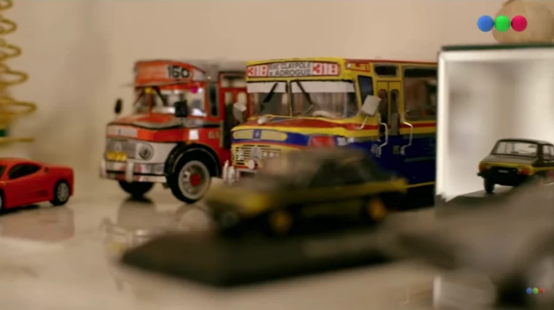 La replica de un colectivo de la linea 318 que se tomaba en Adrogué y uno de la 160 que iba desde zona sur a Ciudad Universitaria son algunas de las piezas con las que se remonta a su infancia. Además, hay varios portarretratos con fotos familiares y una repisa para los premios que consiguió por su labor humorística en TV y en el teatro.