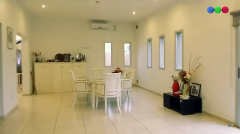 El living comedor y la cocina tienen un factor común: el blanco. La gran vedette es la mesa con tapa de mármol y las sillas de estilo victoriano. Se destaca un detalle arquitectónico que brinda luminosidad debido a que en el comedor hay varias ventanas con forma de tira y vidrio fijo que dan al jardín.