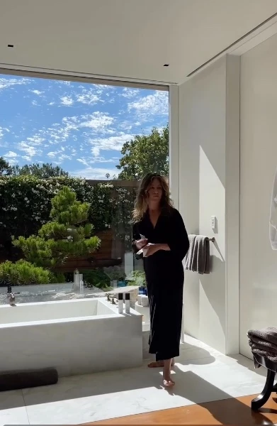 Otro de los sitios de relax de la actriz es el baño: realizado completamente en mármol, este cuenta con una bañera que permite observar un pequeño jardín y tiene grifería en acabado de bronce, tanto en la ducha como en el lavabo. También posee una lámpara globo suspendida en el techo y una hermosa alfombra textil.
