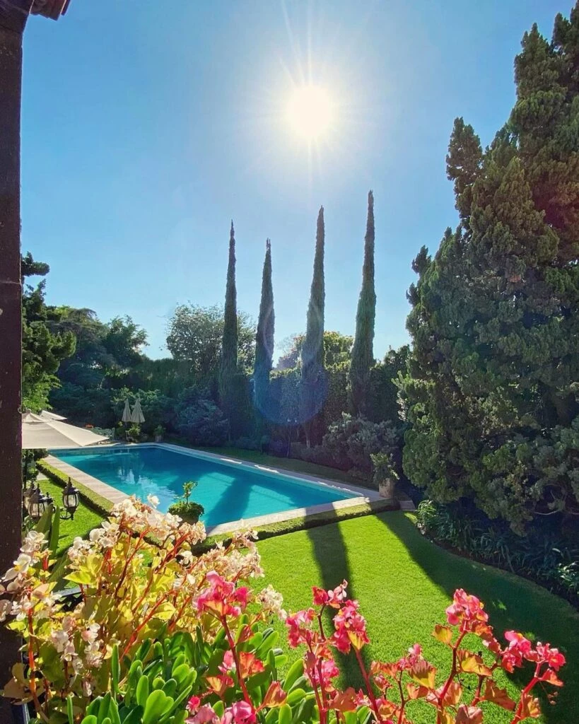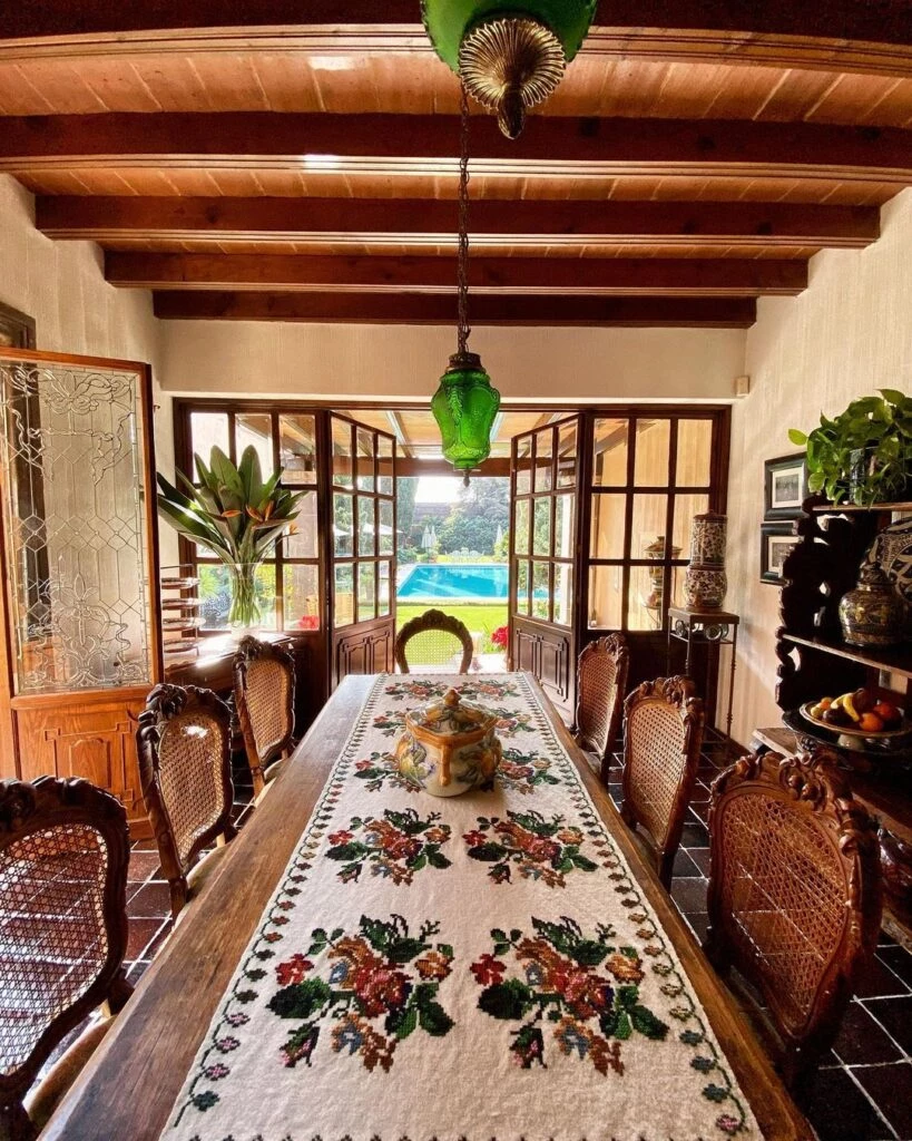 A través de sus redes, el mexicano compartió algunas postales de este hogar, como el comedor que posee ventanales y puertas de madera, cuadros y faroles antiguos, vegetación de interior, pisos de cerámica y techo de madera. Desde este lugar, se puede ver una gran pileta ubicada en el jardín, rodeado de mucho verde.