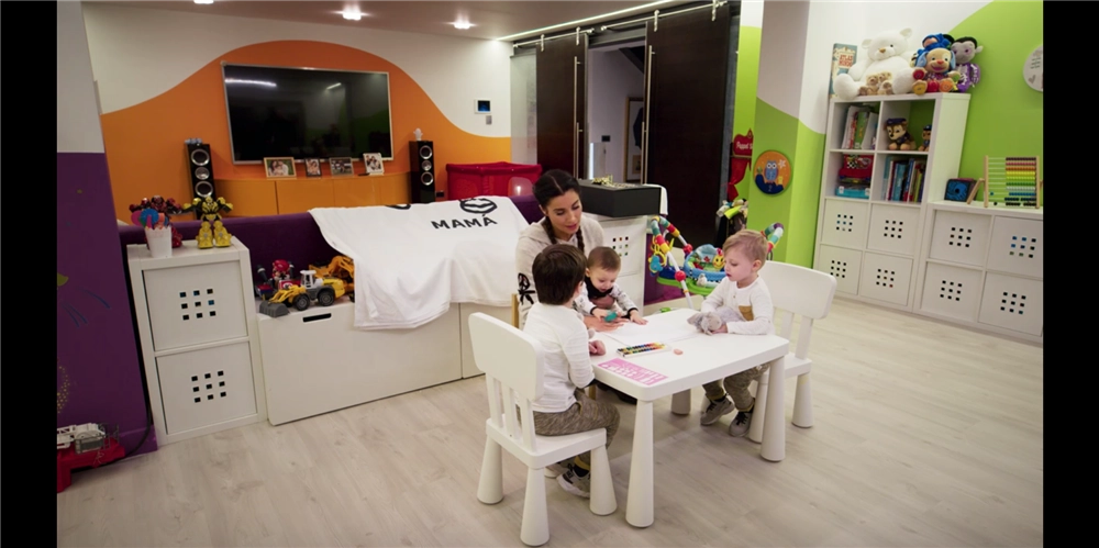 El playroom tiene rincones para jugar, leer, relajarse, hacer manualidades. Cada rincón se vincula a un color diferente (y no son precisamente de la paleta de los pasteles). Llama la atención una enorme pantalla de televisión.