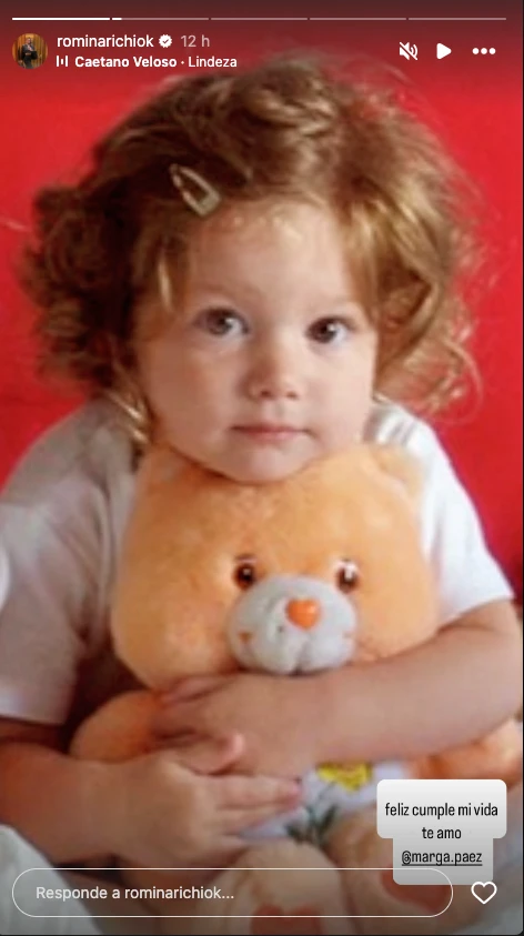 Por su parte, Romina Ricci también le dedicó varias historias de sus redes con mensajes lleno de ternura: “Feliz cumple mi vida. Te amo”, escribió la actriz sobre una foto donde se ce a la niña abrazando a su oso de peluche, mientras de fondo suena el tema “Lindeza”, de Caetano Veloso