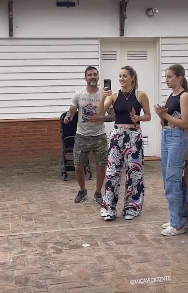 Mica Viciconte también eligió un outfit bien cómodo: pantalón suelto con estampa floral, y musculosa negra más zapatillas. En tanto que Fabián Cubero prefirió bermudas y remera de mangas cortas, aprovechando el clima primaveral.